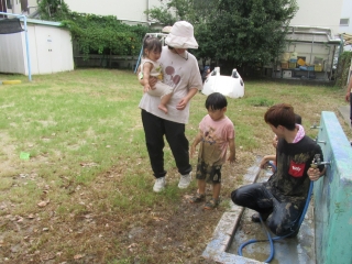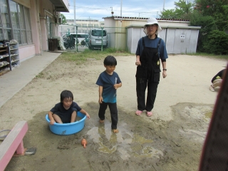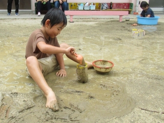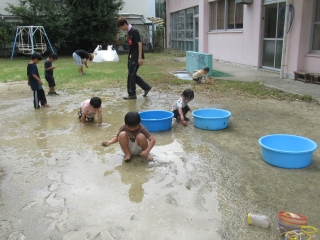 | 9月に第2回のファミリーデイを行ないました。今回の遊びは「泥あそび」。園庭にたくさんのお水を撒いて子どもたちは大喜び!最初は、泥が手や足に付くことをためらっていましたが、ツンツンと指でさわってみたり、足を水たまりに浸けてチャプチャプしてみたりするうちに、だんだん慣れ、最後は全身で泥の感触を楽しんでいました! みんなが泥あそびをしている間に、お父さんや祖父母の方々と家族懇親会を行ないました。この会には、放課後等デイサービスに通っている先輩お母さんにも参加していただき、当時の子育ての悩みや、現在に至るまでの思いなど話してもらい、父親の役割、父母の協力関係などについて意見交換しながら交流を深めることができました。 |