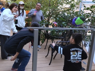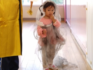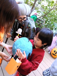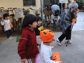 姫島こども園では、子どもたちと職員が一緒に仮装してハロウィンを楽しみました。そして今年は風の子そだち園へ遊びに行き、利用者の方とハロウィンを通して交流しました。少し緊張している子もいれば、自分から利用者の方にお話をしている子もいたり、それぞれの時間を過ごしました。お菓子をもらう時間になると、職員や利用者の方から魔法の言葉を教えてもらい「トリック・オア・トリート!」と元気よく伝え、クッキーをゲット!最後にはカボチャや黒猫などの『張り子』やペープサートをいただき、大満足の子どもたちでした。