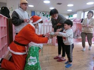 12月25日にクリスマス会を行ないました。昨年同様、同じ法人内施設の「風の子そだち園」の利用者さんがクリスマス会を盛り上げに来てくれました!クリスマスの歌を一緒に歌ったり、パラバルーンをしたり、とても楽しい時間となりました♪今回は、感謝を込めてサンタさんに扮した利用者さんに、クラスごとに作ったリースをプレゼントしました☆今年もサンタさんが子どもたちみんなにクリスマスプレゼントを届けてくれました。