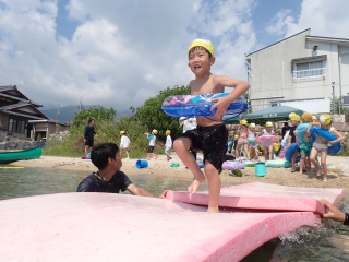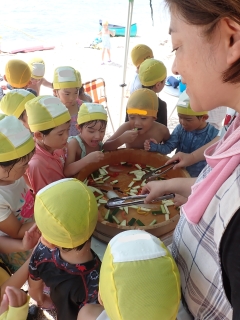比良風の家にて、びわ湖キャンプを行ないました。天候にも恵まれ、湖水浴やスイカ割りなど、夏ならではの遊びを満喫しました。子どもたちにとっては初めてのお泊まり行事でしたが、「また行きたい!」とみんなが話すほど、思い出に残る楽しいキャンプになりました。 |