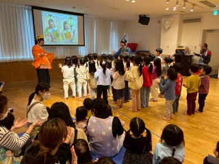 スクリーンの前に立ち、ひなまつりの手遊びに合わせて体を動かしました
