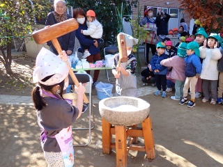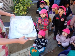 | 毎年恒例のおもちつき大会、今年も風の子保育園の園庭で行ないました。これは新年を迎えるために受け継がれてきた伝統文化を子どもたちに知ってもらい、楽しむことを目的にしています。年長児さんは実際に杵を持ち、お餅をつきました。その様子を3歳児、4歳児、そして保育園の乳児クラスと風の子ベビーホームの子どもたちが見守り、もちつきのリズムに合わせてみんなで応援をしながらお餅をつきました。5歳児のお兄ちゃんやお姉ちゃんがお餅をついている姿には子どもたちも釘づけ!乳児さんたちも大きな声で一生懸命応援していました。完成したお餅は、おやつとして厨房職員が薄切りにして焼いて、おかきにしてくれました!そしてたくさんお餅をついたので玄関に鏡餅を作って飾りました。最近ではおもちつきなどをする機会が減ってきているだけに、このような伝統行事を大切にしてこれからも一緒に楽しんでいきたいです。 |
