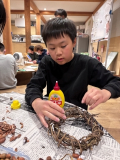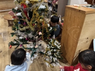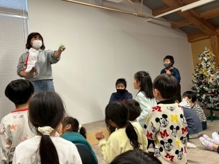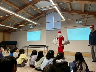 | ホールでクリスマス会を行ないました。児童館にサンタさんがやってきて、6年生のピアノ演奏と共にみんなで合唱をしました。他にも職員の合奏や子どもたちが用意したクイズで大盛り上がり!その後は「集まれゲーム」や「背中メッセージリレー」をし、楽しみながら一生懸命取り組みました。クリスマスプレゼントももらえて素敵なクリスマス会になりました。 |