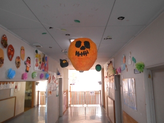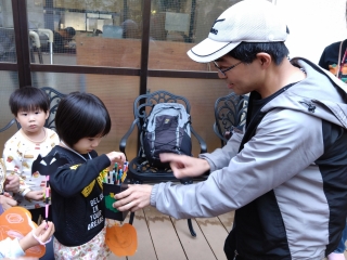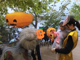 姫島こども園では、子どもたちと職員が一緒に仮装してハロウィンを楽しみました。そして今年は風の子そだち園へ遊びに行き、利用者の方とハロウィンを通して交流しました。少し緊張している子もいれば、自分から利用者の方にお話をしている子もいたり、それぞれの時間を過ごしました。お菓子をもらう時間になると、職員や利用者の方から魔法の言葉を教えてもらい「トリック・オア・トリート!」と元気よく伝え、クッキーをゲット!最後にはカボチャや黒猫などの『張り子』やペープサートをいただき、大満足の子どもたちでした。