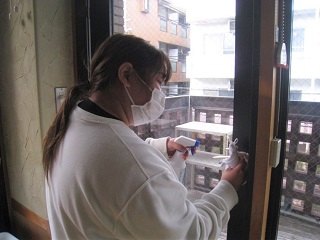 保護者の方々には、消毒をしてから入室してもらうようにしています。
