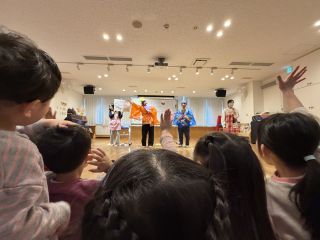 スクリーンの前に立ち、ひなまつりの手遊びに合わせて体を動かしました