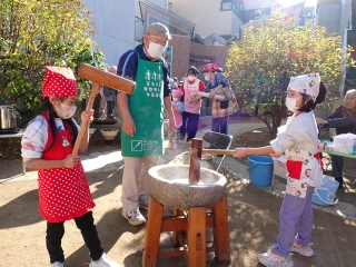 | 毎年恒例のおもちつき大会、今年も風の子保育園の園庭で行ないました。これは新年を迎えるために受け継がれてきた伝統文化を子どもたちに知ってもらい、楽しむことを目的にしています。年長児さんは実際に杵を持ち、お餅をつきました。その様子を3歳児、4歳児、そして保育園の乳児クラスと風の子ベビーホームの子どもたちが見守り、もちつきのリズムに合わせてみんなで応援をしながらお餅をつきました。5歳児のお兄ちゃんやお姉ちゃんがお餅をついている姿には子どもたちも釘づけ!乳児さんたちも大きな声で一生懸命応援していました。完成したお餅は、おやつとして厨房職員が薄切りにして焼いて、おかきにしてくれました!そしてたくさんお餅をついたので玄関に鏡餅を作って飾りました。最近ではおもちつきなどをする機会が減ってきているだけに、このような伝統行事を大切にしてこれからも一緒に楽しんでいきたいです。 |