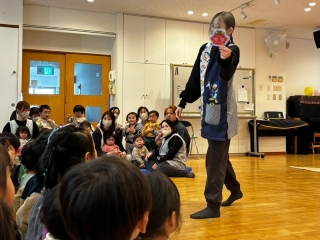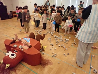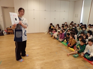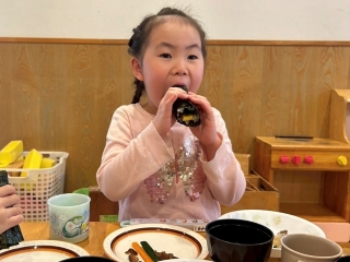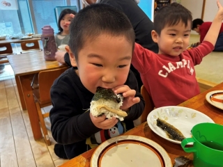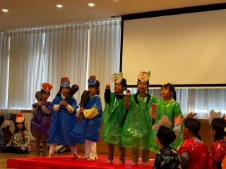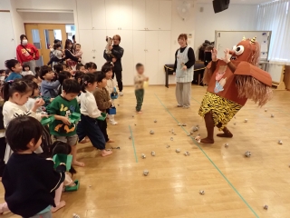| 今年の節分行事は乳幼児合同で行ないました。職員が節分について子どもたちにわかりやすく説明をしたり、シルエットクイズをしたり、みんなで楽しみました。そして年長児さんに「かぜのこももたろう」の劇を披露してもらいました。その後は昨年の運動会で登場した「トロル鬼」が「怒りんぼ鬼」と「泣き虫鬼」を連れて風の子保育園にやってきました。「鬼は外~!」「福は内~!」と豆をまいて子どもたちがトロル鬼を退治しました。お昼ごはんは節分メニューの恵方巻を食べました。恵方を向いて、心の中で願いごとをしながら、黙々と食べる子どもたちでした。 |