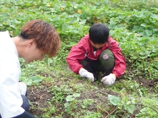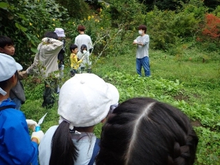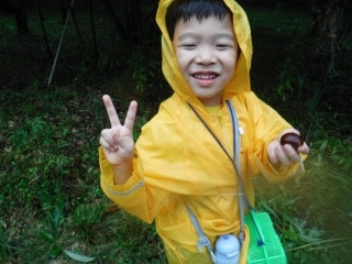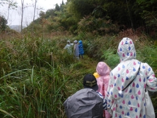 今回の自然学校は電車と車を利用して丹波へ行きました。お芋が元気に育つようにとお互いに励まし合いながらみんなで草抜きをがんばりました。また近くのお寺の鐘つきや、ススキの迷路でのかくれんぼができました。カエルやアカハライモリなど雨の日ならではの生き物にも出会えました。限られた時間でしたが、自然との触れ合いを楽しみました。