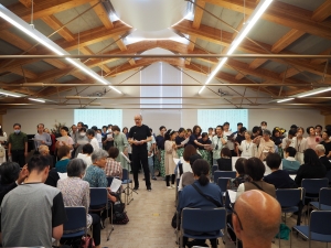 | 2025年9月27日、令和7年度の総会が水仙福祉会「すいせん」3階ホールで開催されました。コロナ禍以降、6年ぶりに対面での総会となりました。当日は、正会員90人中31人が出席し、委任状の提出は37人でした。賛助会員の皆さんも含めると、全体で152人の参加となりました。 第1部は、岸本会長のごあいさつに続き、令和6年度の事業報告と決算報告、令和7年度事業計画案と予算案、そして役員選任の審議が行なわれ、すべての審議が承認されました。役員選任では、長年会長を務められた岸本氏の後任としてニッセイ・ニュークリエーション元会長の余部氏が新会長に就任されました。副会長には松田氏に代わり韓氏が、会計監査には北山氏に代わり顧問の用山氏が就任されました。松田氏は新たに顧問として引き続きお力添えをいただきます。なお、元会長で顧問の禅定氏は今回でご退任となりました。最後に、水仙福祉会の松村理事長より祝辞をいただき第1部が終わりました。 第2部では、利用者や職員、地域の方々による和太鼓演奏やフラダンス、合唱などのイベントを楽しみました。会場は終始あたたかい雰囲気に包まれ、笑顔あふれる楽しいひとときとなりました。また、1階ギャラリーでは手織りとアート作品の展示、成人施設で作った焼き菓子等の販売を行ないました。 |