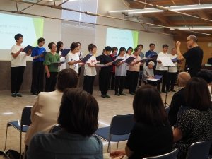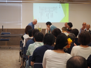 | 6月25日、吹田市文化会館メイシアター中ホールで、福本淳さんのコンサートが開催されました。福本さんは当会の賛助会員であり、水仙福祉会の施設で音楽講師をしておられます。このコンサートは、「ハンディのある方々にも気軽に足を運んでいただけるようなコンサートを実現させたい」という福本さんの強い思いにより企画されました。当会もその趣旨に賛同し後援をさせていただきました。 コンサートには水仙福祉会・風の子そだち園およびワークセンター豊新の利用者・職員合同チームがゲストとして出演しました。広く知られた数々の歌をメドレー形式にした合唱曲を数ヶ月かけて練習してきました。本番で、堂々とそして懸命に歌う姿に、場内いっぱいに感動の輪が広がりました。フィナーレの曲は、水仙福祉会おなじみの「風をみたひと」でした。客席におられたこの曲の作詞者の禅定正世前会長が舞台に上がり、あいさつをしました。そして、福本さんの掛け声とともに風の子そだち園とワークセンター豊新の利用者が舞台に集合し、会場全体で大合唱。お客様からは「心があたたまりました」「元気をもらいました」との声もいただき、会場全体が幸せな気持ちに包まれた素敵なコンサートでした。そして、水仙福祉会の利用者のためにとコンサートの売上金704,000円を当会にご寄付してくださいました。福本さんのあたたかいお気持ちに心より感謝申し上げます。お気持ちにこたえらますよう利用者のために有効に使わさせていただきます。本当にありがとうございました。 |