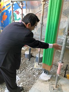 | 2018年(平成30年)2月20日、松村理事長と松村総合施設長、髙橋事務局長をはじめ各施設長が集まり、また、設計士や工事関係者とともに上棟式が行なわれました。全員が順番に御幣に向かって一礼し、その後、理事長が最後のビスを締めました。続いて、理事長、総合施設長、事務局長が順次、日本酒・お米・塩を四隅に撒いて清め、最後に御幣を建物内に納め、終了しました。 |